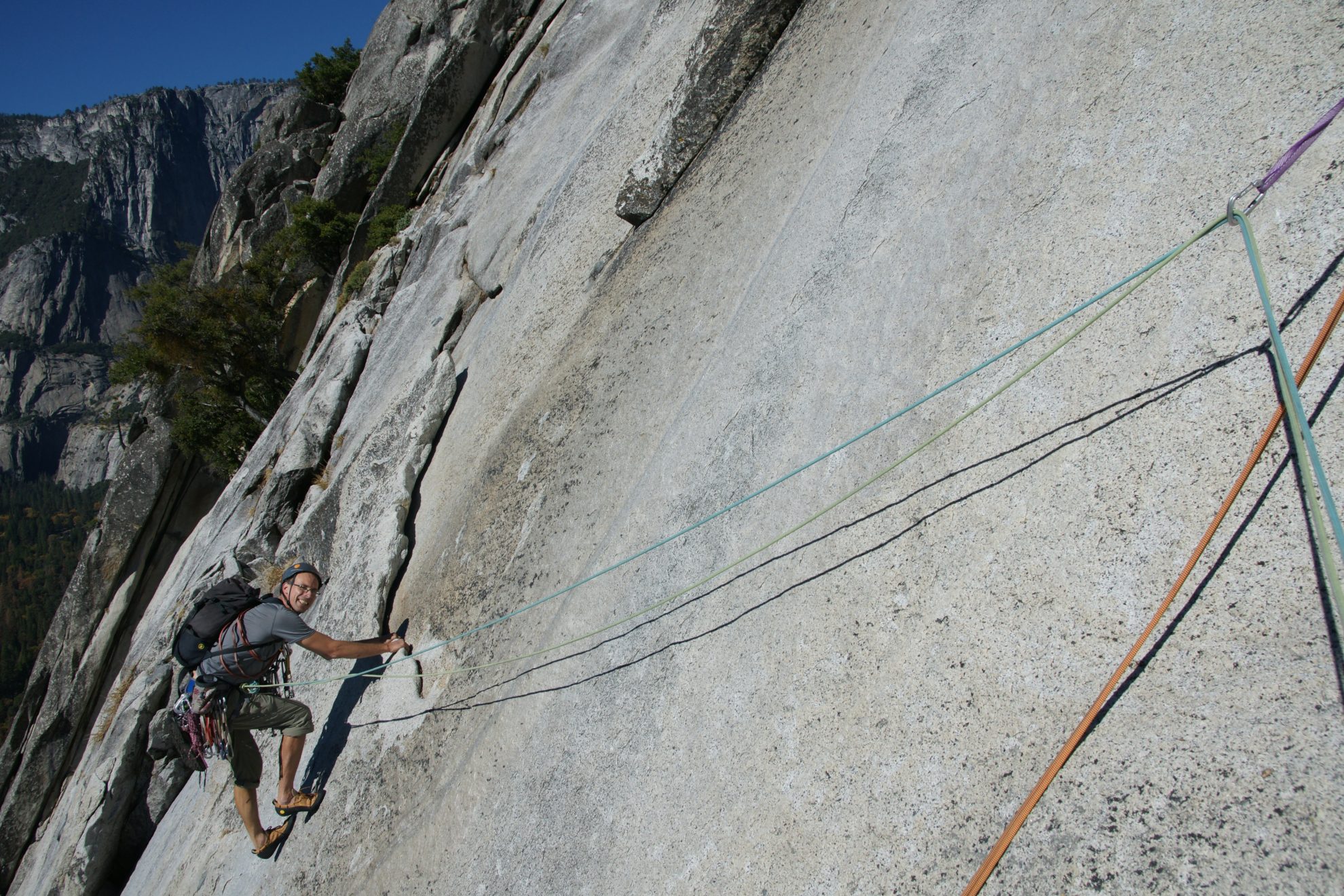 The third pitch is longer, easy, but still fun, and I use almost the whole rope length before anchoring on a ledge in a small alcove. The sun’s higher now and the view’s opening beneath us of the pine trees, meadows and high walls of the Valley. It’s great to be back.
