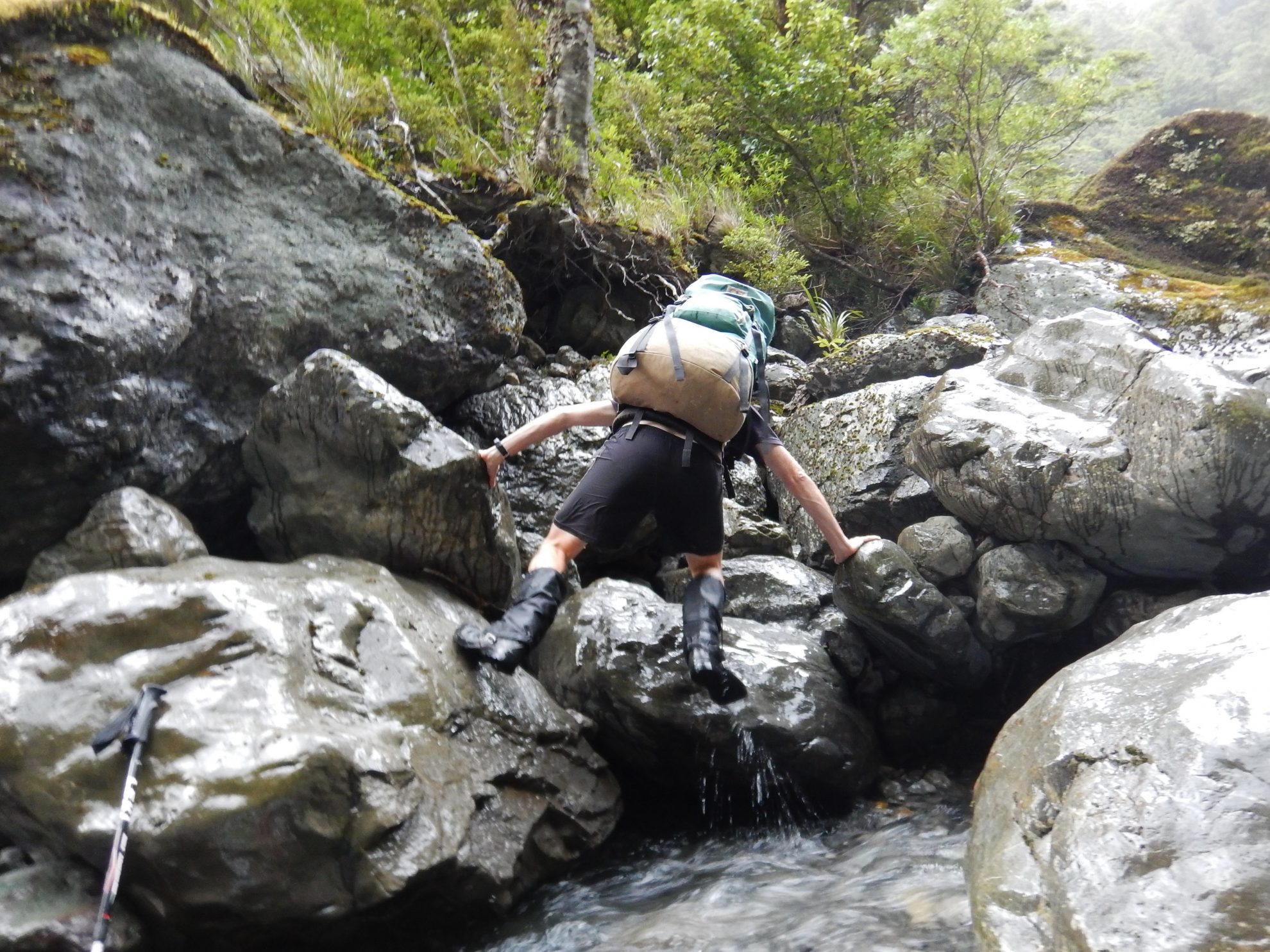 This involves leaning or laying your body back as you move up. You pull on a surface with your hands (like a tree root or edge of a boulder), while your feet push against a surface. It’s called a layback because you lay or lean your body backwards or even sideways.
