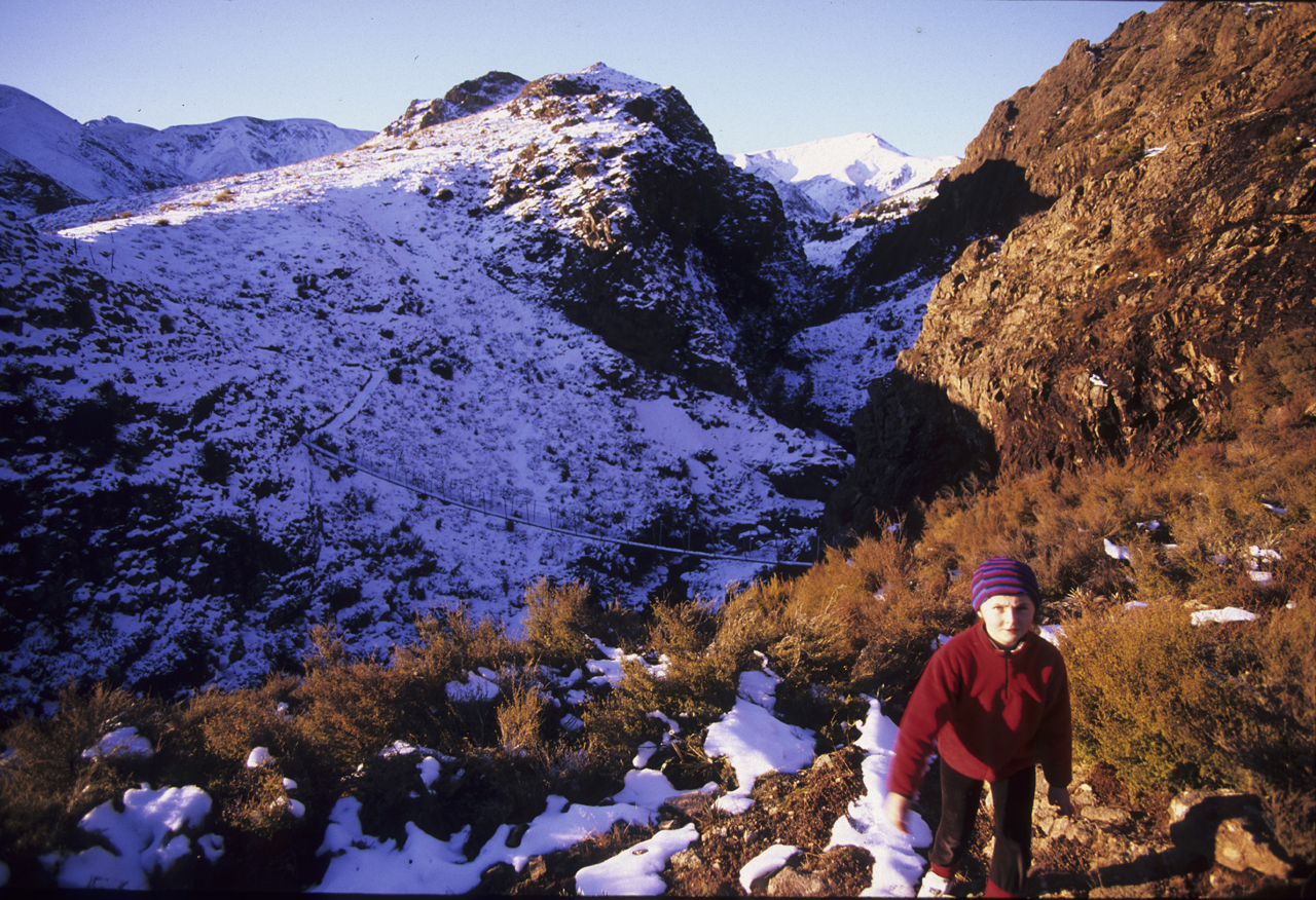 Bernadette takes a little coaxing from her book beside the fire but once outside revels in the snow plodding. I piggy-back her across the stream to visit the nearby canyons, waterfalls, and spectacular swingbridge as the afternoon fades to dusk and strong westerly light floods in from the distant Southern Alps.