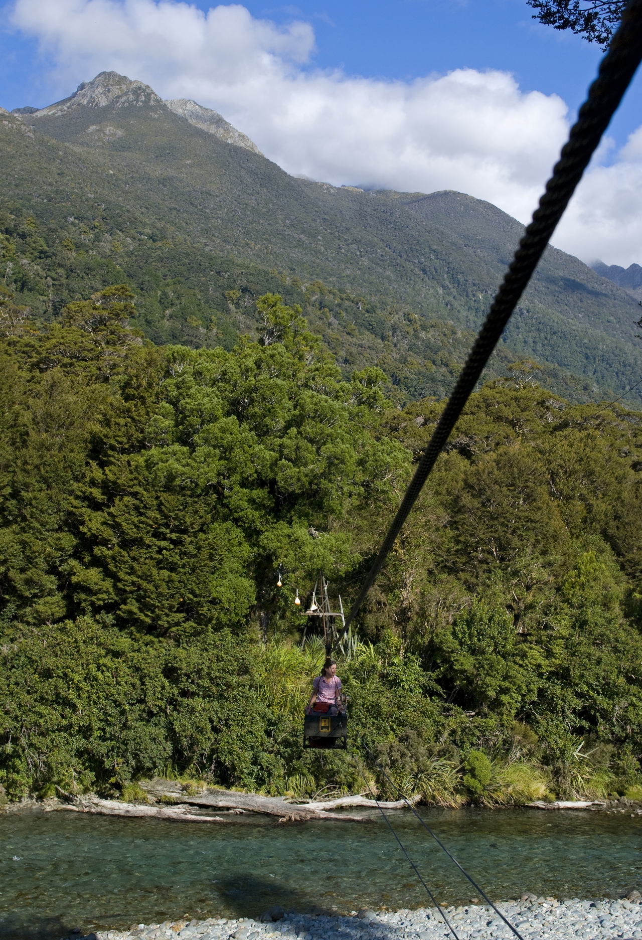 Using a wire cage to cross the Olivine River on the Pyke-Big Bay route is a godsend when the river is running high as the cage provides access to Olivine Hut. I chose a vertical format to frame the river crossing against the distant peaks.