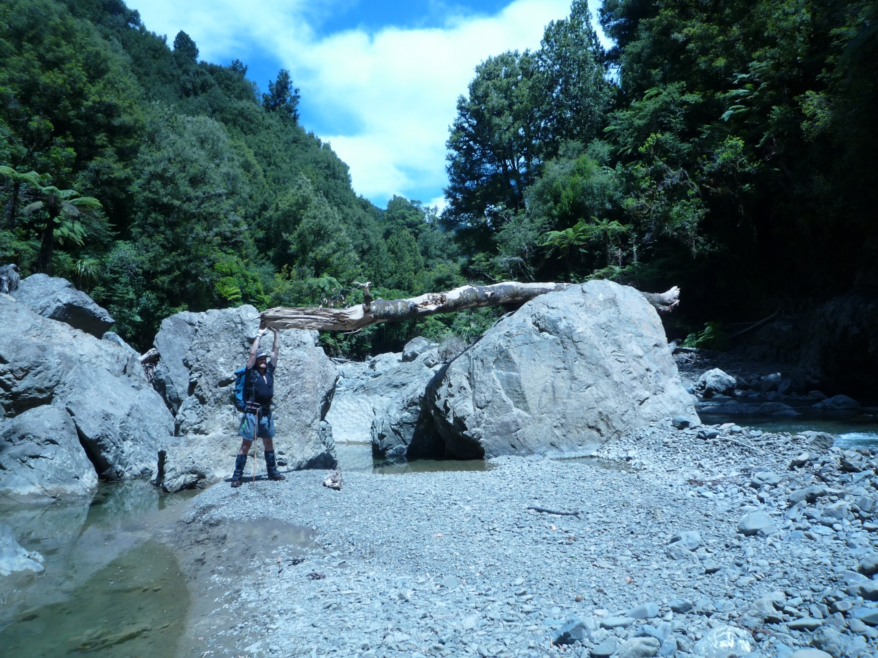 The second day is the most memorable. The trip between Tawa Hut and Koranga Falls Hut is down the Kahunui Stream bed and is a magical meander on a sunny day. About a kilometre down from Tawa Hut, the track terminates, propelling you down a rocky terrace into the gorge. Over the next few hours, high rock walls, massive boulders, pebble islands, perching logs, hissing waterfalls, cascading rapids and deep green pools are encountered in quick succession. However, progress is generally straightforward.