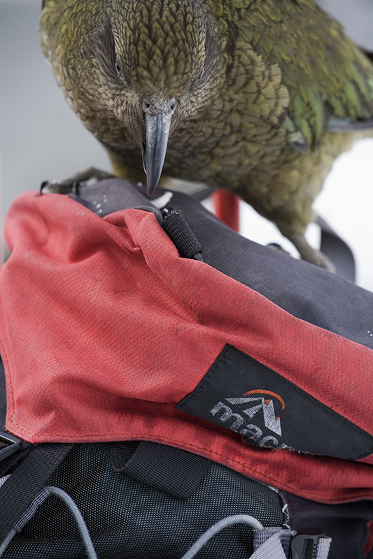 A curious kea in Craigiburn Valley, Arthurs Pass. The backpack still bears the scars of the encounter. Camera settings Canon 5D at 1/250th, f/6.7 with a 70-200mm lens.