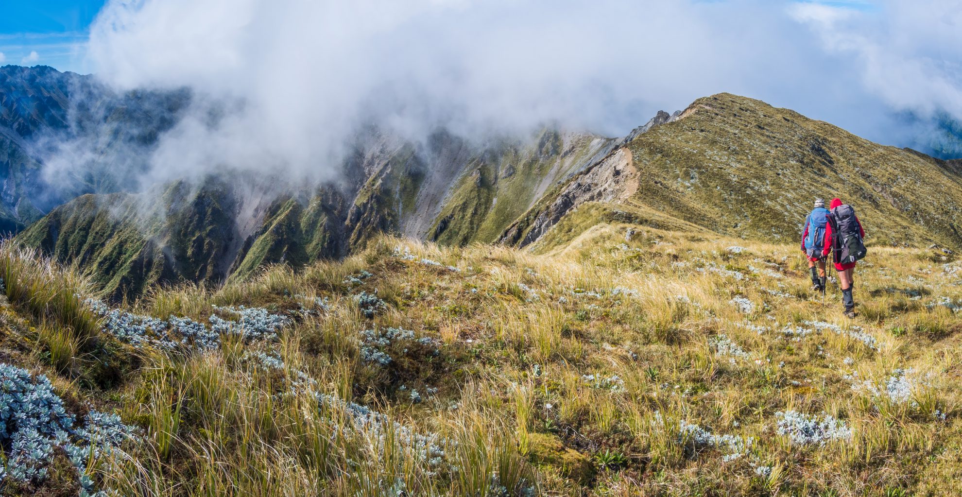 After a steep scramble, we reached a small platform, beyond which was our crux – a narrow, exposed and broken knife-edge (a cheval), leading to the summit of Te Hekenga. With our packs on and no rope, our resolve started to dissolve.