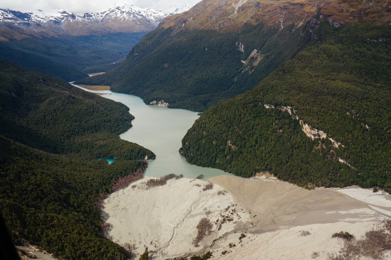 The slip at Sandy Bluff, 10km north of the southern end of the track, has blocked the path of the Dart River, forming a lake in Dredge Flats. The lake is around 4km long and 20m deep.