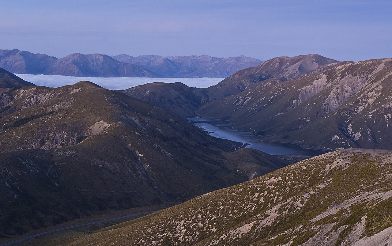 At 5am and at around 1650m, the glow of dawn was upon me. I set up camera and tripod, stunned by the beauty that was slowly being revealed. The Canterbury Plains lay blanketed in fog. Hills and peaks rose above it, like islands in a white ocean. To the south, Lake Lyndon shimmered in the early light.