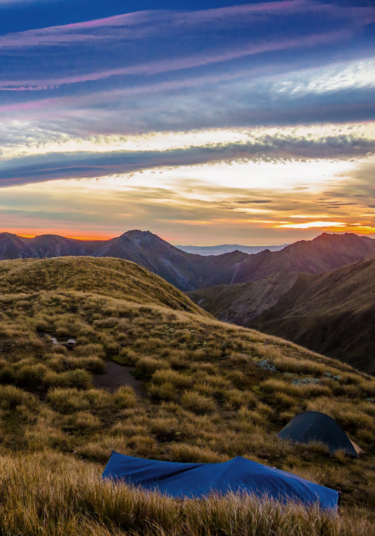 On the first night of a four day trip into the highest points of the Ruahines, we camped near some tarns close to Iron Peg (1703m). After a chilly night under the fly, we were rewarded with this beautiful dawn cloud and light show.