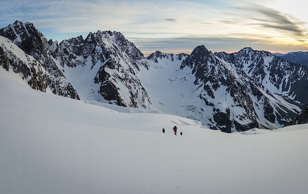 Not every day in the mountains begins, even in fine weather, with a soft pink glow that builds to a fiery and almost unreal orange dawn. On the South Cameron Glacier, en route to Mt Arrowsmith, the sun rose without such pomp or ceremony. But the soft light, on blessedly firm snow, did provide a […]