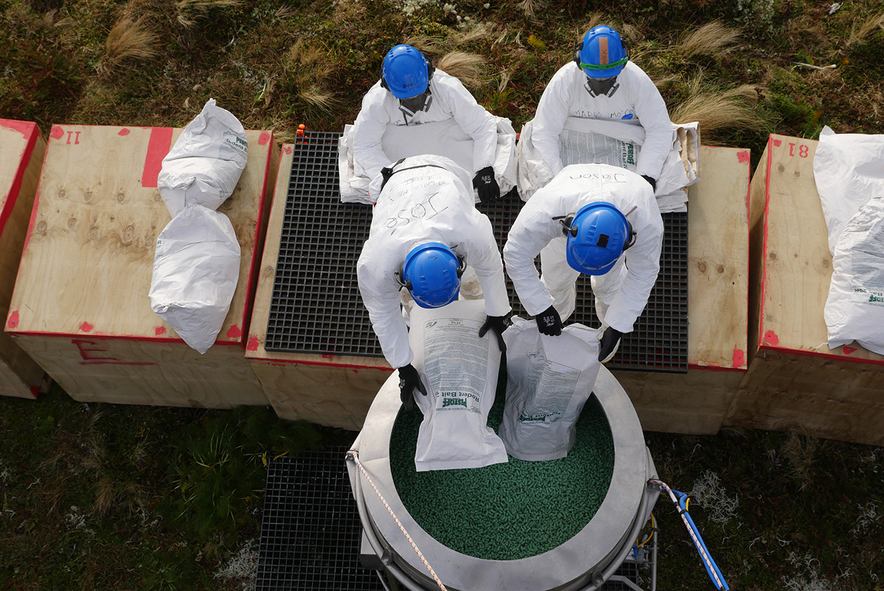 Almost straight away, there’s a problem. The helicopter company has brought three aircraft: a lithe-looking Squirrel and two ponderous Iroquois, one of which has a malfunction: the hook that carries the bait bucket won’t engage. It’s a setback. Each of these big helicopters can lift 1200kg of bait per flight, so every hour of downtime draws the operation out into uncertain weather.