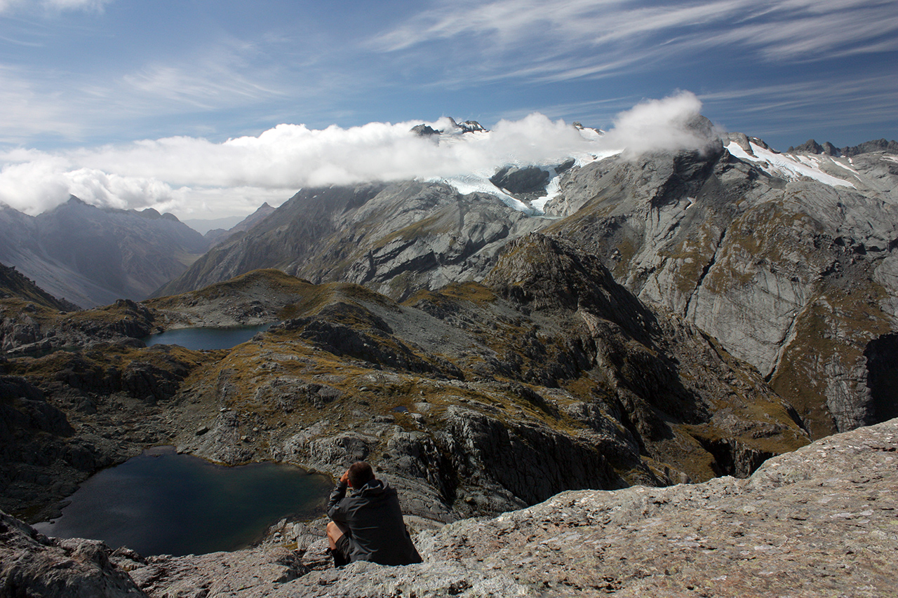 The start of the trip was a stark contrast: a rare period of five consecutively sun-kissed days. Veering off the Routeburn Track after roughly 500m, we’d tracked up Sugarloaf Pass before descending into gnarled and mossy beech trees beside a tumbling creek. We’d squelched across plains alongside the Rock Burn and onto Theatre Flat, a huge arena surrounded by mountains that glowed as the sun set on glaciers. Park Pass waited after that, and a steep, scrambling detour to the aquamarine depths of Lake Nerine had me wondering if weather that good could possibly last.