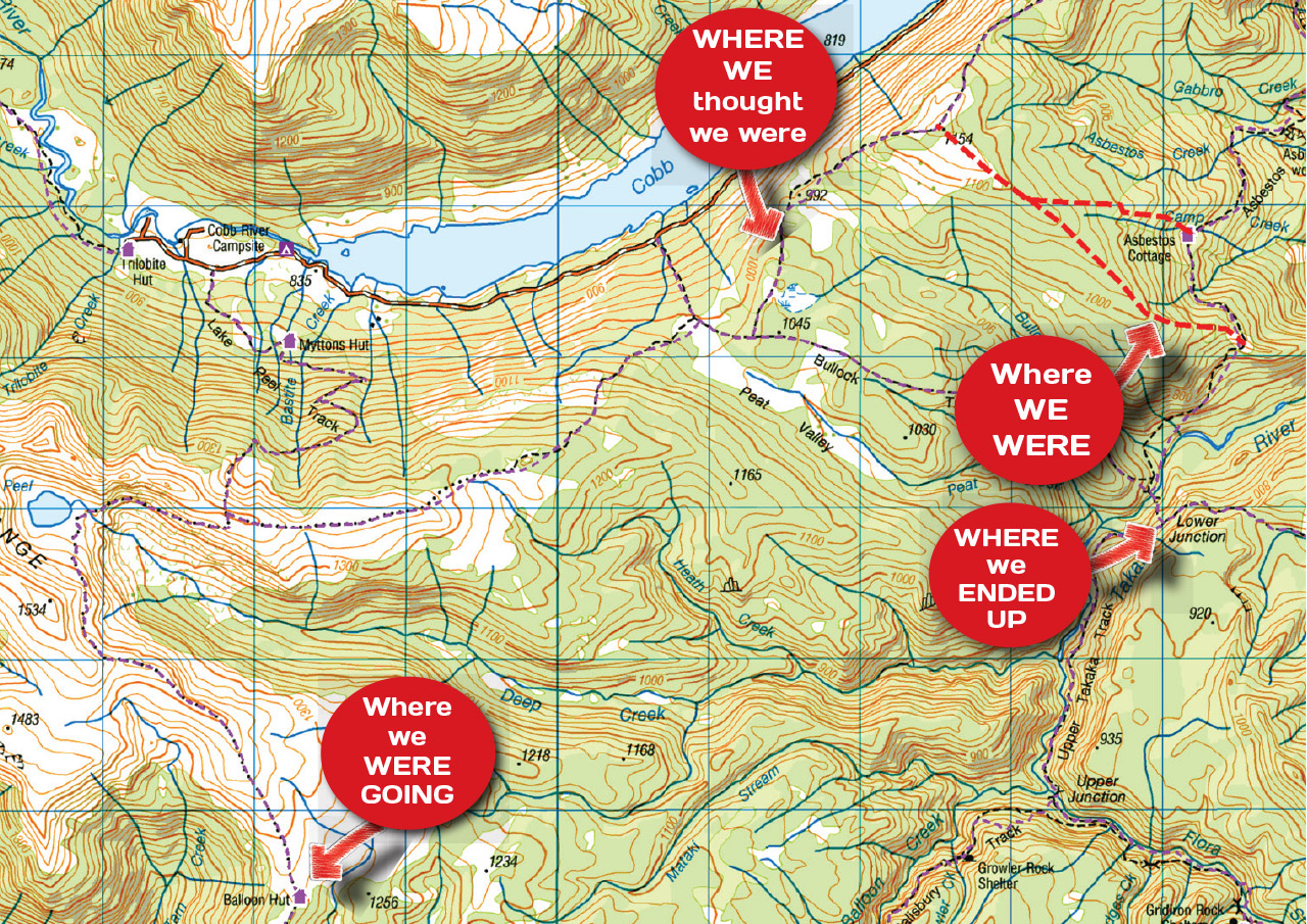 We wanted to get onto Cobb Ridge, tramp past Lake Peel and end the day at Balloon Hut. Asbestos Cottage sits at around 830m and the marked track leads to the Takaka River before climbing the steep Bullock Track 700m to the crest of Cobb Ridge. It would mean going down before we went up. I shook my head at the prospect of needlessly losing altitude.