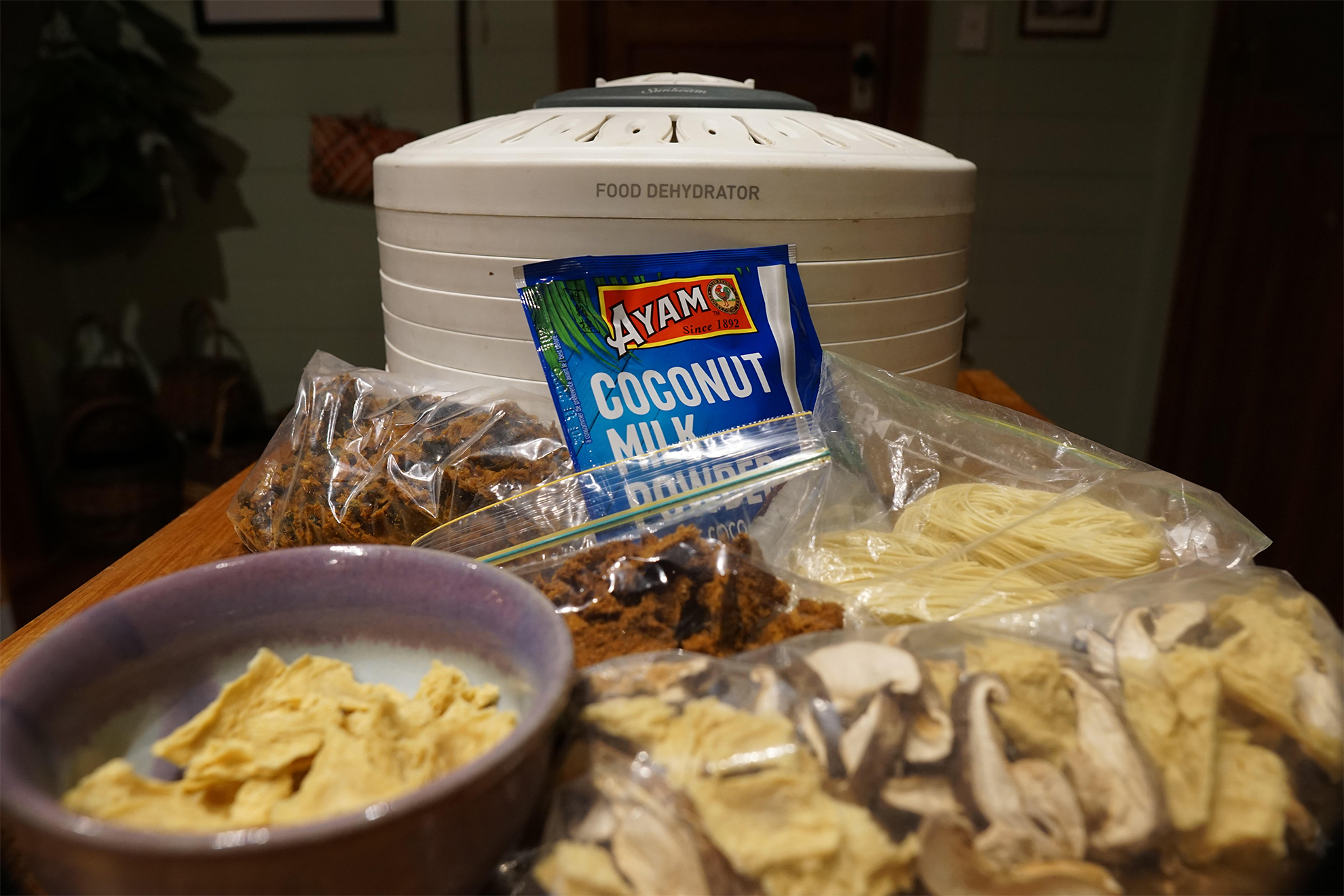 → Tofu – drain the water and pop it in the freezer until it becomes stringy like chicken (typically about 24 hours). Then thaw it and squeeze out the water. At this stage it will easily pull apart into chunks that can be dehydrated.