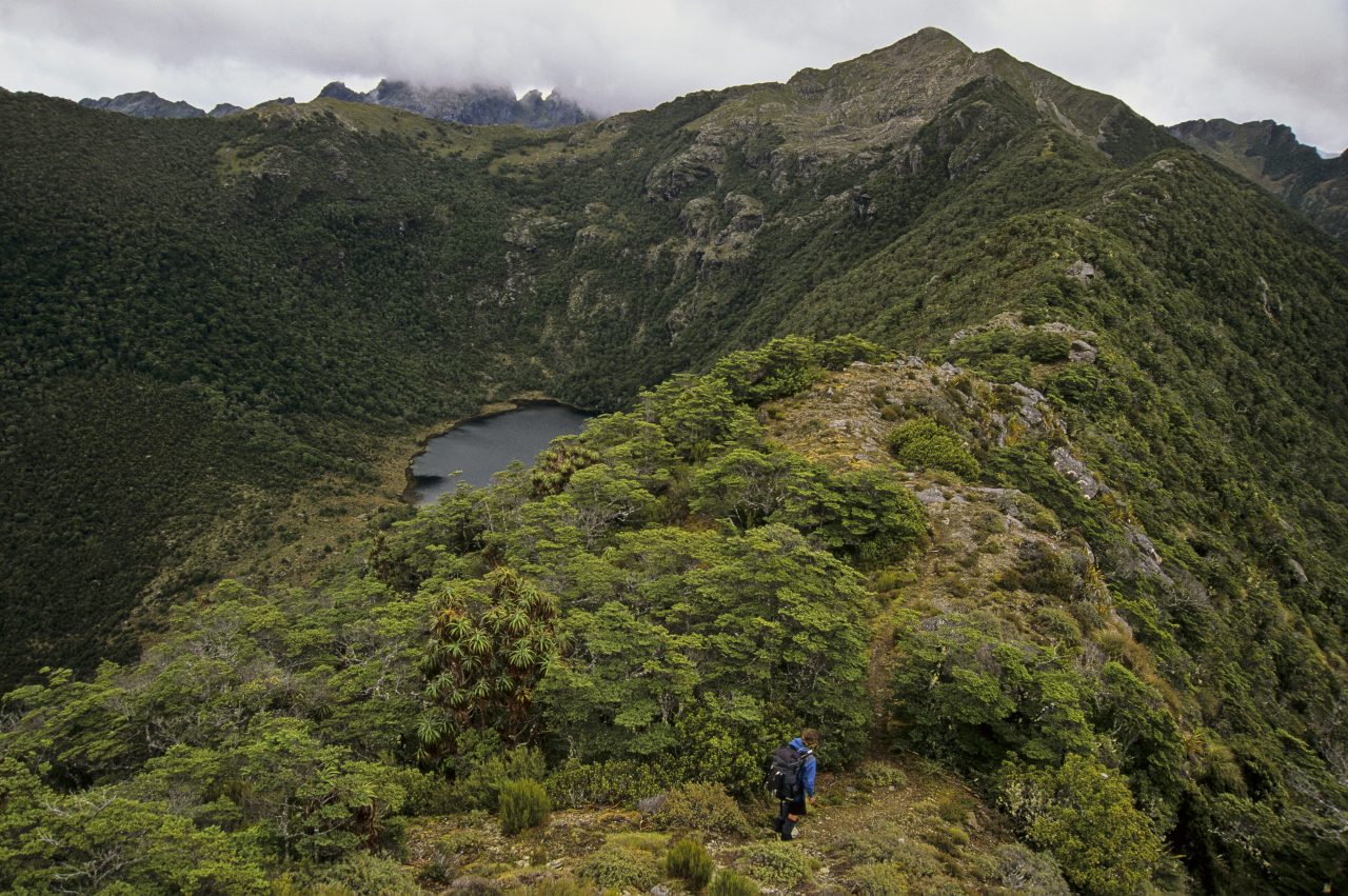 The Douglas Range contains perhaps the most spectacular tramping country in Kahurangi National Park – and in a 450,000ha wonderland, that’s really saying something. Stretching between the Cobb Valley in the south and the Aorere Valley in the north, the range is one of contrasts: delicate tarns fringed by bogs where sundews trap hapless insects; peaks so precipitous they cast shadows even at noon in summer; stunted beech forest mingling with rocky outcrops; the jumbled chaos of the Lead Hills, where granite blocks lie like some sort of precarious game.