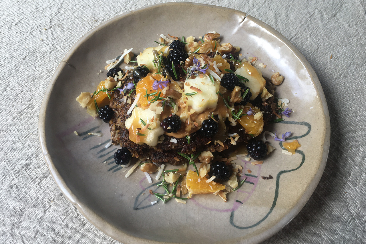 Serve slathered with peanut butter and honey (put these on first so the heat from the pancakes melts them into a spreadable sauce), chopped fruit, a sprinkling of fresh rosemary or mint, and some nuts and seeds for crunch.