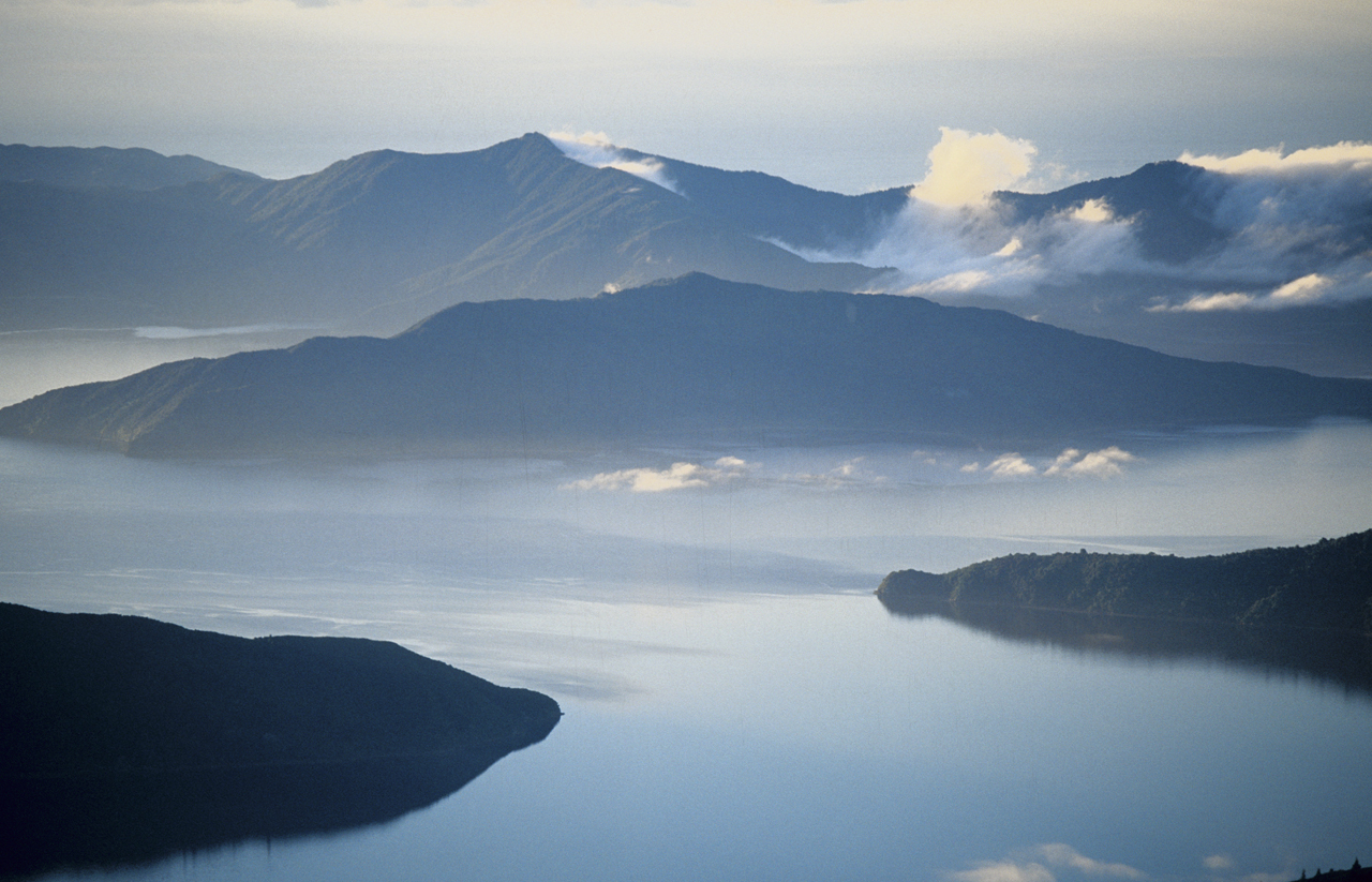 The juxtaposition of water, hills, and mist set amid glorious dawn light is a splendid reward for those who venture to the summit of Mt Stokes in the outer Marlborough Sounds at break of day. This isolated summit, lying near the head of Kenepuru Sound, and overlooking both Pelorus and Queen Charlotte sounds is a magnificent setting for capturing the spread of light over the landscape of the Sounds.