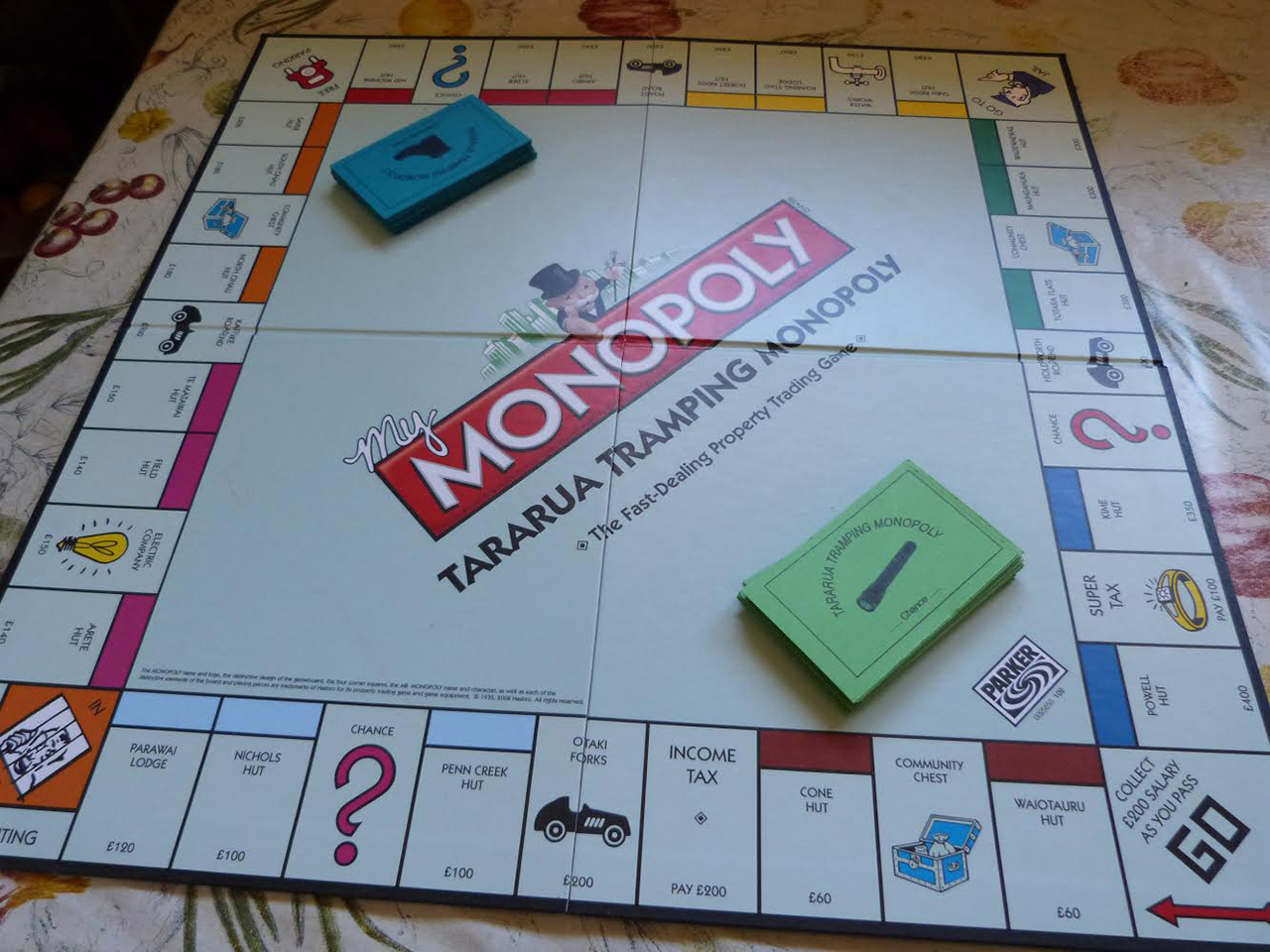 I’d always thought I’d like to make a personalised Monopoly board, and after discovering that Hasbro, the makers of Monopoly, for a short time allowed you to design your own board (which they would manufacture and send to you), I experienced a rare ‘lightbulb’ moment. Yes, I would design Tararua Tramping Monopoly. No, it wouldn’t be easy.