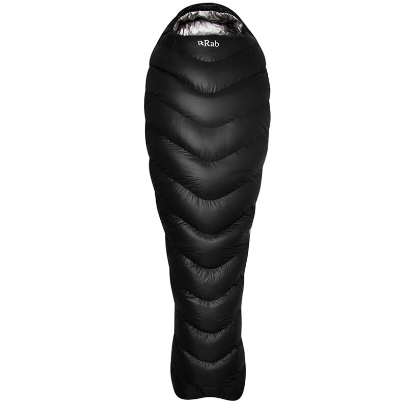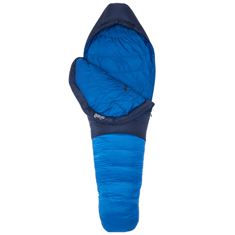 This bag has ExpeDry water-repellent 800FP goose down insulation paired with Pertex Quantum fabric to ensure warmth even when wet. There’s a fixed hood, anti-snag zipper, fold-down second zipper, anatomically designed footbox and curved baffles to reduce down movement. Comfort rating 2°C. 720g.