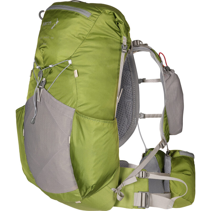 This is a multi-purpose pack for fast-paced activities – day hikes or overnighters. Its close-fitting back system flexes as you move but maintains its shape. There’s a forward pull hipbelt, top entry, stash and drink bottle pockets, hipbelt pockets, walking pole attachments and a raincover. 1050g. www.outfitters.net.nz