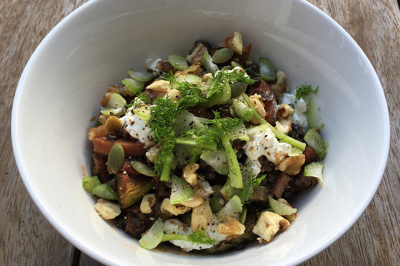 Fragrant fennel breathes life into the otherwise mundane marriage of pantry basics dried lentils and canned tomatoes. The aniseedy sharpness from fennel mellows out nicely when braised. Add dried black lentils – fibre and protein-packed morsels which readily absorb the flavours bubbling in the pot, hold their shape well and are reasonably fast-cooking.