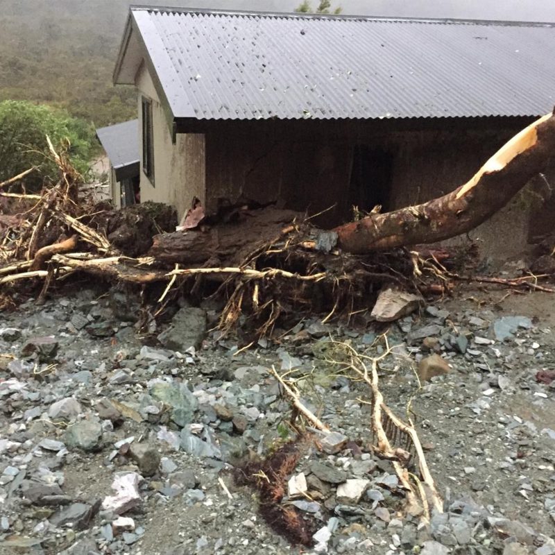 At 1.30am a landslide roared down the slope above Howden Hut with a noise like a train. It obliterated the toilet block and smashed into the side of the hut, shunting mud and gravel into the bunkroom and slamming a massive tree through the wall.