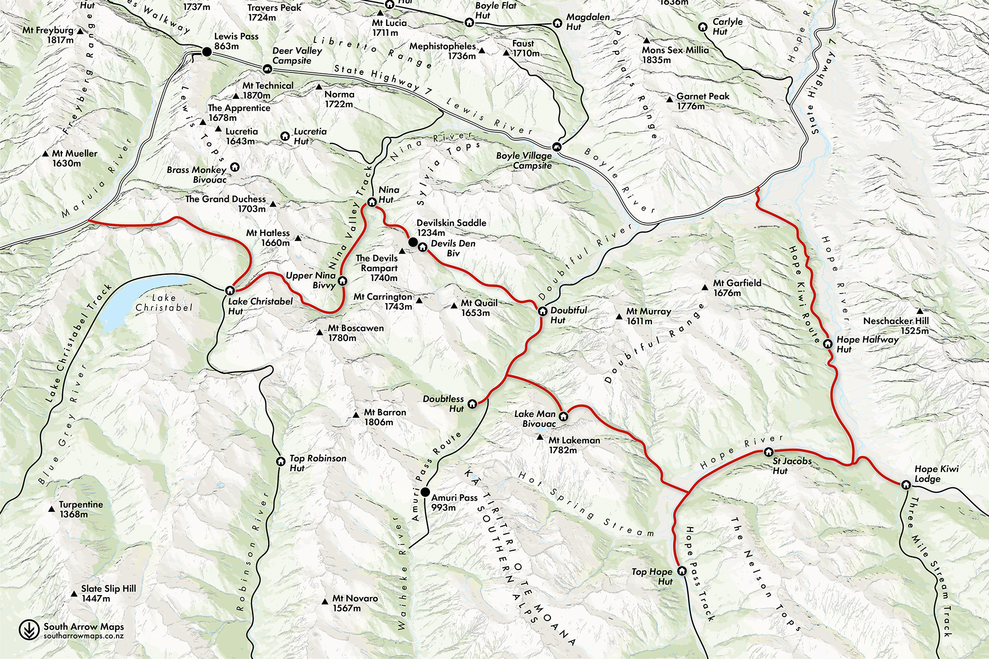 Our planned five-day route will lead us up Rough Creek to Lake Christabel, from where we’ll go off-track, crossing the Main Divide and dropping into the Nina Valley. We’ll then valley hop into the Doubtful and Hope rivers before making our way back to SH7 and a short hitch to the car. There will be rolling tussock tops, spectacular beech forest, gnarly stream travel, clear green rivers, lush grass flats and cosy huts.