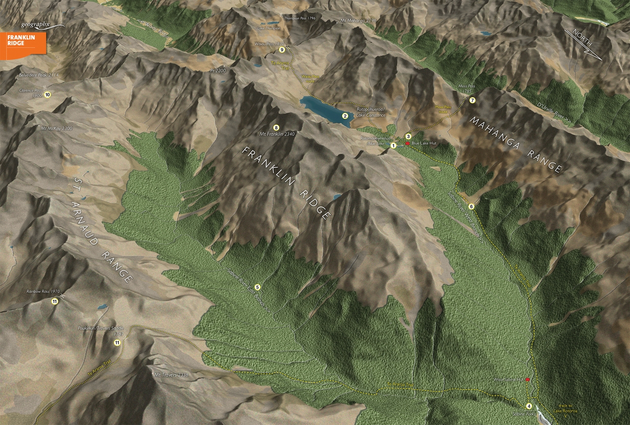 Located right in the heart of Nelson Lakes National Park, Franklin Ridge forms a roughly shaped arrowhead pointing almost due north down the Sabine Valley.