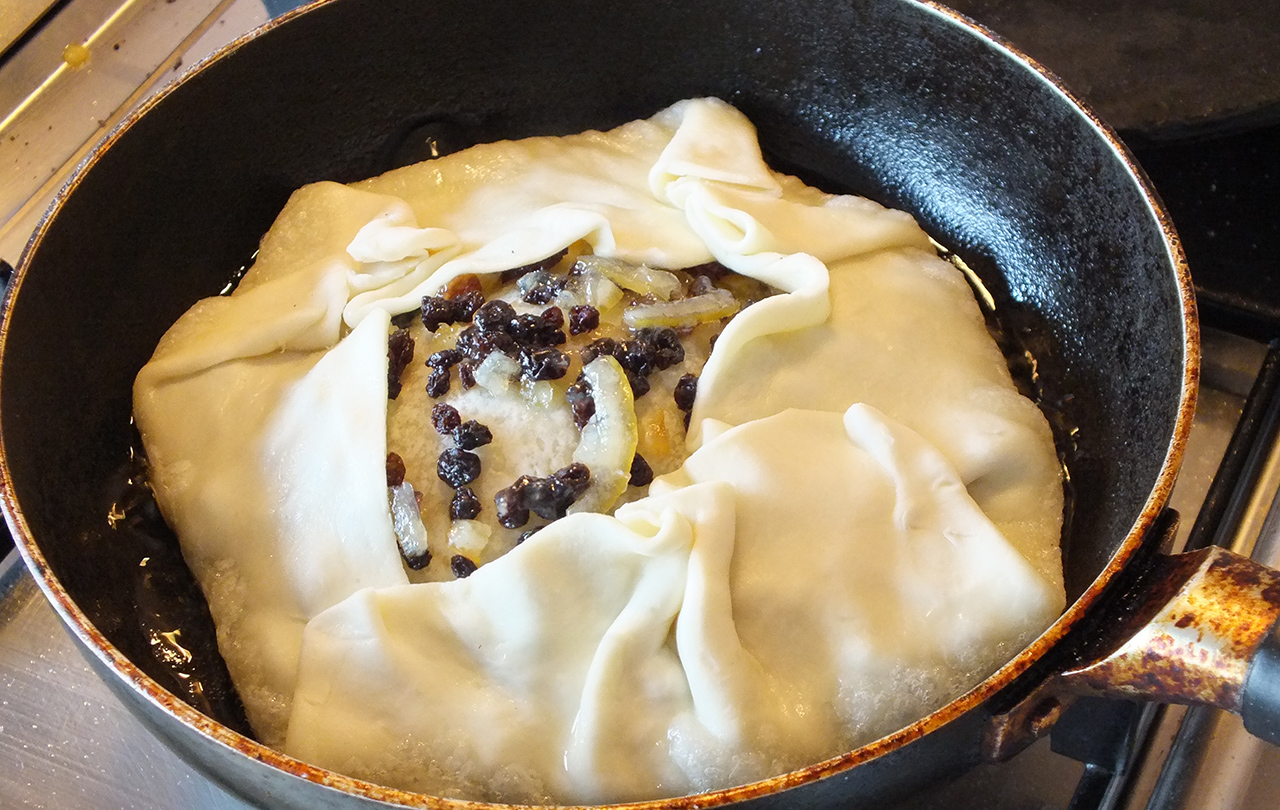Place some butter in the base of a frying pan and lay the pastry so that it hangs over the sides. Arrange the filling in the centre and fold the surplus pastry back over the top. Leave a hole in the middle for the steam to escape.
