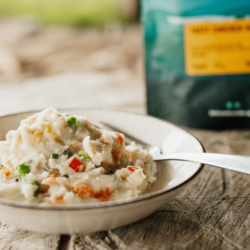 Creamy mashed potato with smoky flavoured freeze-dried chicken, cheese and vegetables. Gluten free. www.backcountrycuisine.co.nz
