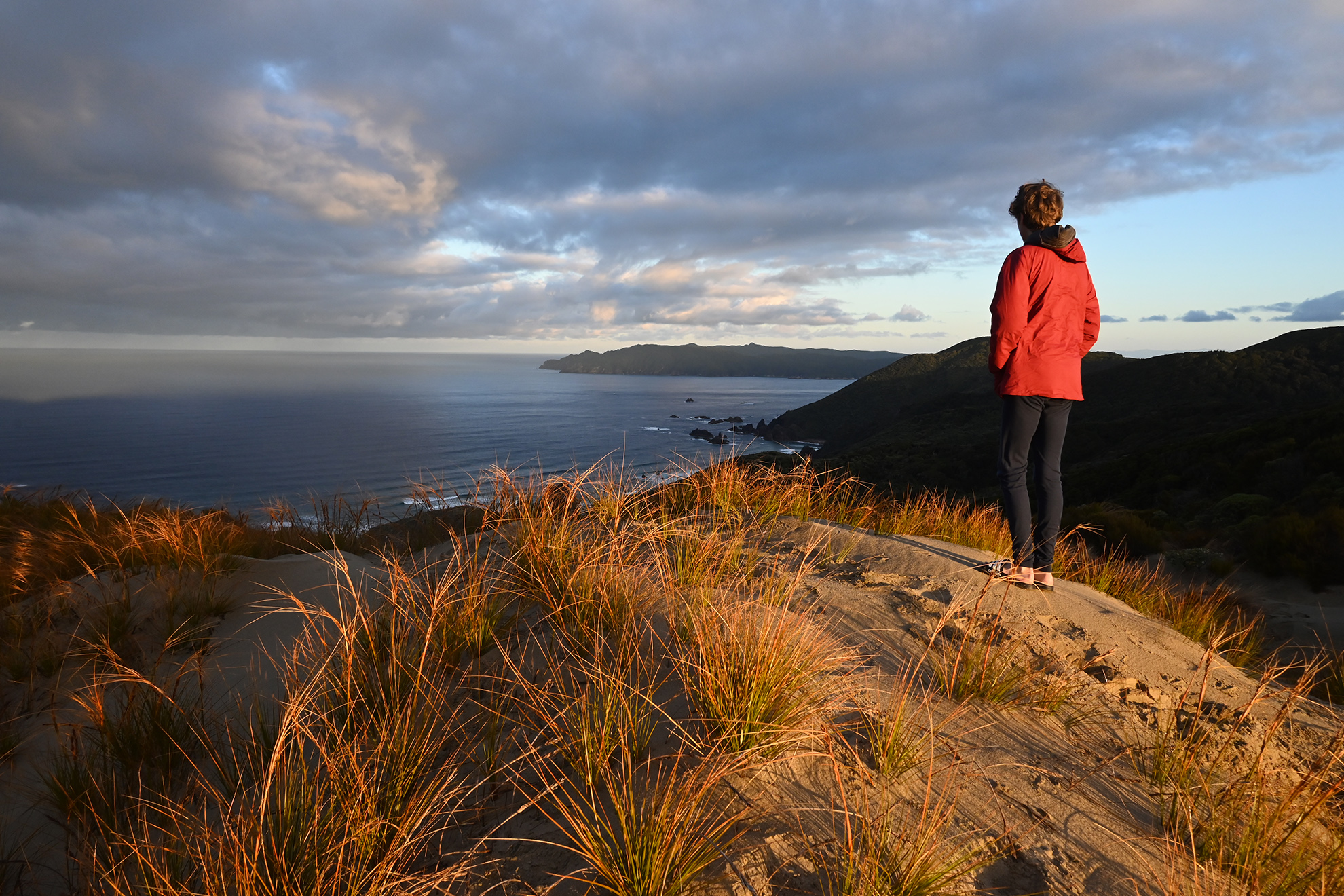 A German and French-Canadian couple told of hunters ahead and young Germans carrying kilos of oatmeal and dishwashing liquid. Kiwi, cat and deer tracks littered the sand. While in the 1990s I would have dropped 200m to the beach, Matti and I now watched the sunset from the top of the dunes.