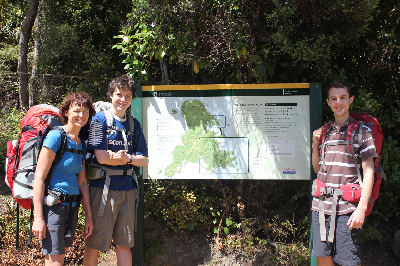 By the time we were up to Stewart Island, Harry was 17 and both boys were carrying their fair share of everything, and still walking miles in front of the adults. We left the Rakiura Track until last mainly for logistical reasons and cost. We combined it with a flight landing at Mason’s Bay, and walking to Freshwater Hut and on to Oban, before joining the Great Walk.