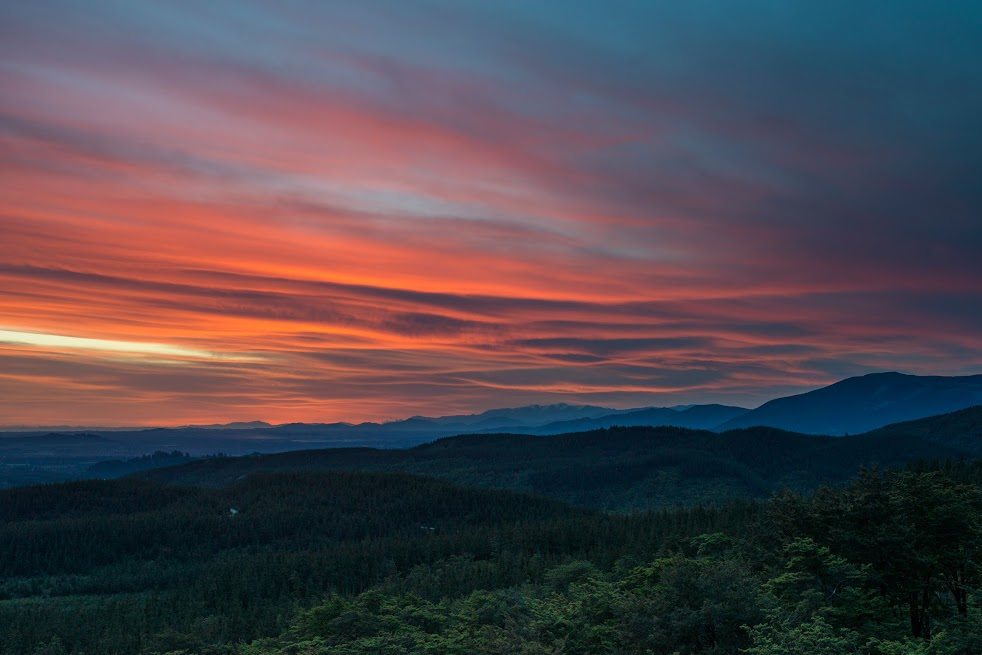 Dusk had fallen and the bush was silent and dark. There was only the distant call of a morepork to welcome me back, plus a vibrant sunset over the plains as I drove the tortuous forestry roads back to Amberley.