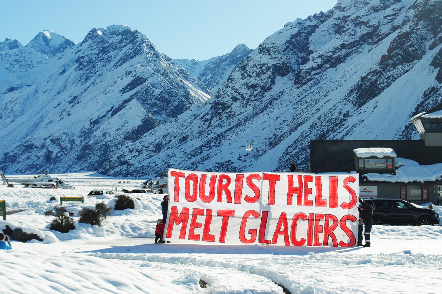 Protestors have taken to Haupapa Tasman Glacier to draw attention to heli-tourism’s complicated link with climate change. The area is a popular tourist attraction and several helicopter operators fly multiple trips each day.