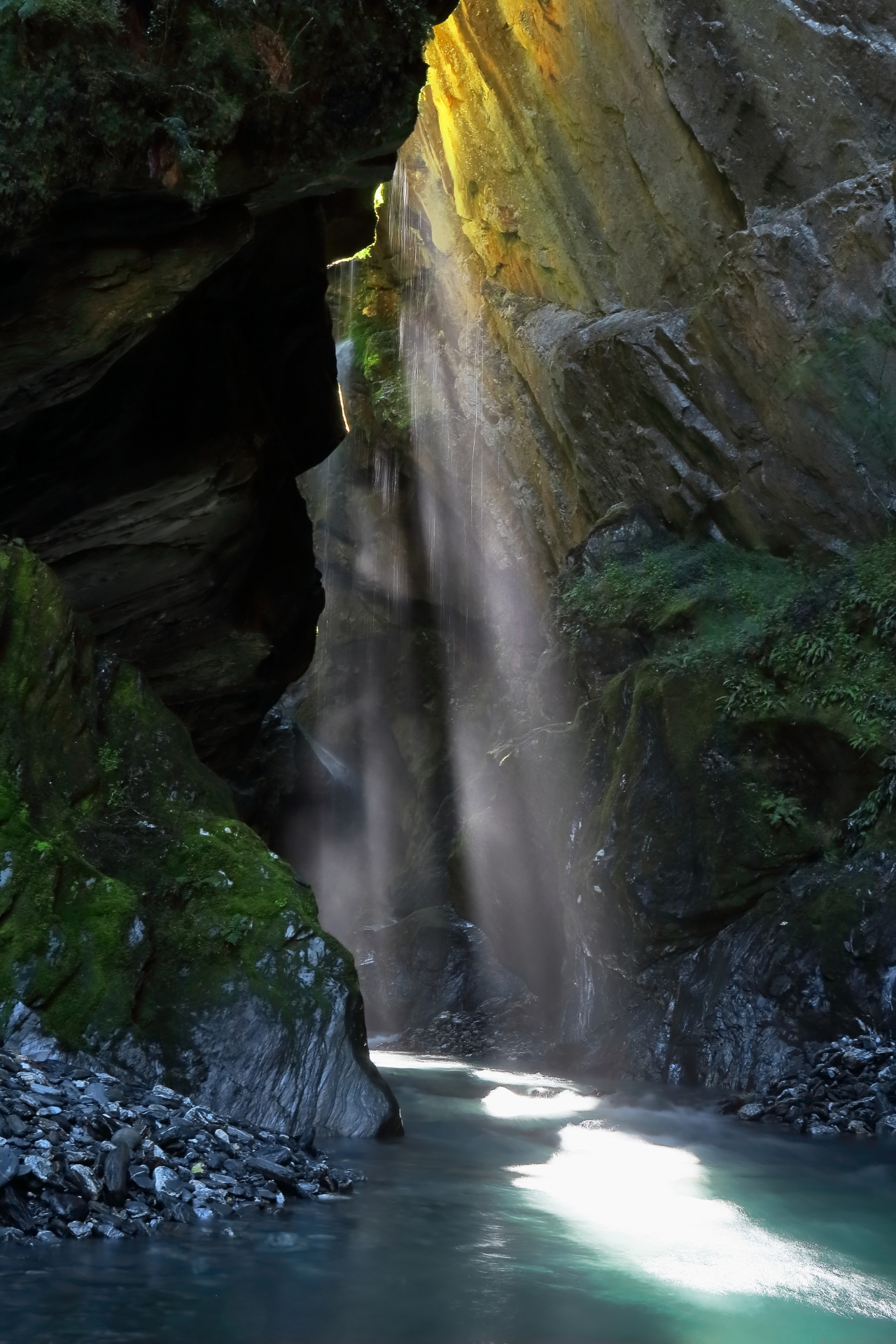 Curiosity had me stumble upon this beautiful ravine in Mt Aspiring National Park and just off the Haast Highway. I noticed the narrow opening of a small stream which joined Haast River 1km south of Fantail Falls. After cautiously following only a couple of snaking turns, the ravine opened up to reveal this magical scene. Soon after taking the photo, a few individuals kitted out in some serious canyoning equipment waded downstream towards me.