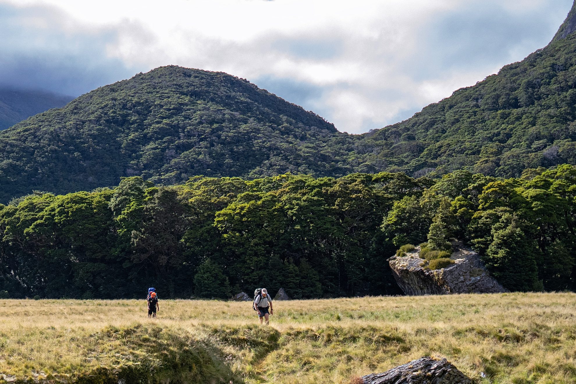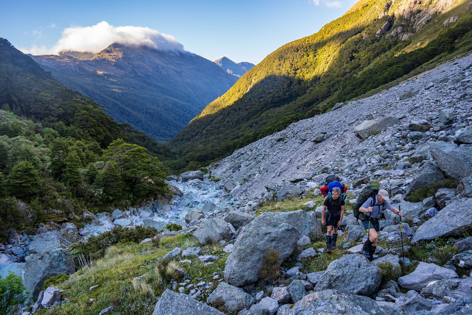 Our poor knees are in for a nasty surprise as the rocky route off Sugarloaf is decidedly downhill. Luckily the way is well marked as we descend through mountain and hard beech forest. We eventually arrive at the Rock Burn, which funnels over truck-sized boulders into pools of emerald green on its journey to the Dart. A few short river flats make travel easier and we cross a number of track wash-outs and rock slides carefully. Wet-boot crossings remind us: ‘This is not the Routeburn.’