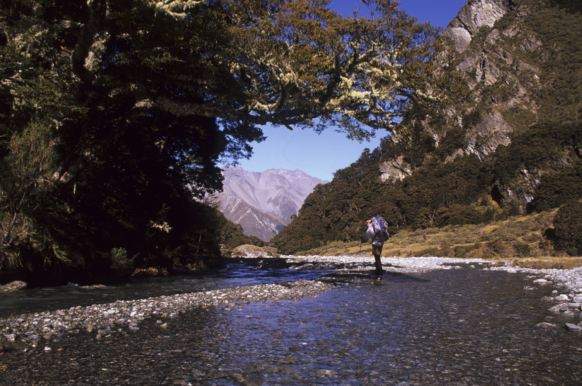 The grassy flats above the gorge have numerous delightful riverside camping spots nestled among boulders and scattered copses of mountain beech as well as an ambience magnified by the massive bluffs of Tent Peak (2089m) on the south side of the valley.