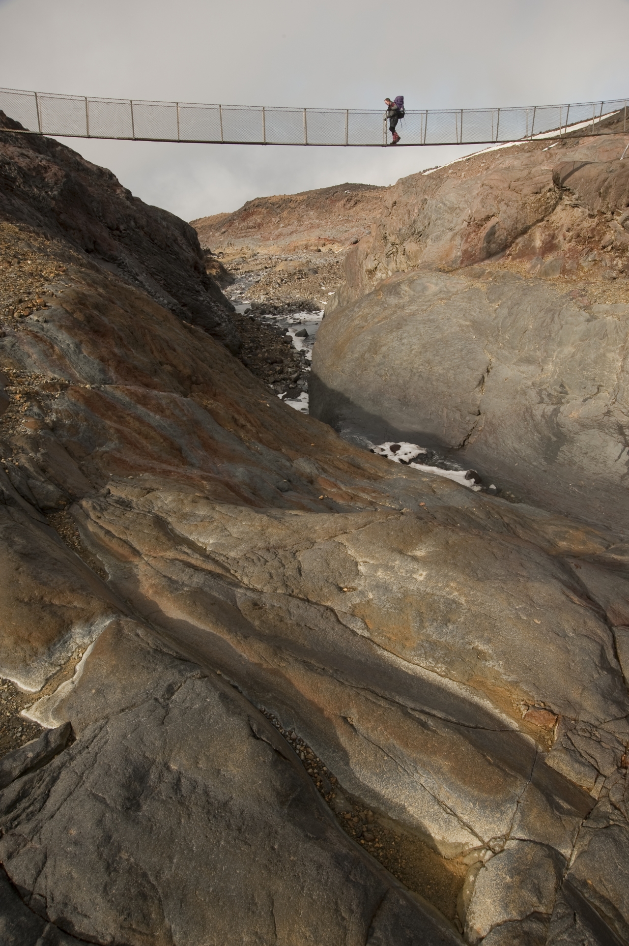Tramper Geoff Norman crosses the swingbridge over the Whangaehu River Bridge, Round the Mountain Track, Tongariro National Park. The Whangaehu is the valley down which periodic lahars flow from Mt Ruapehu’s Crater Lake, and previous versions of this bridge have been wiped out in such events.