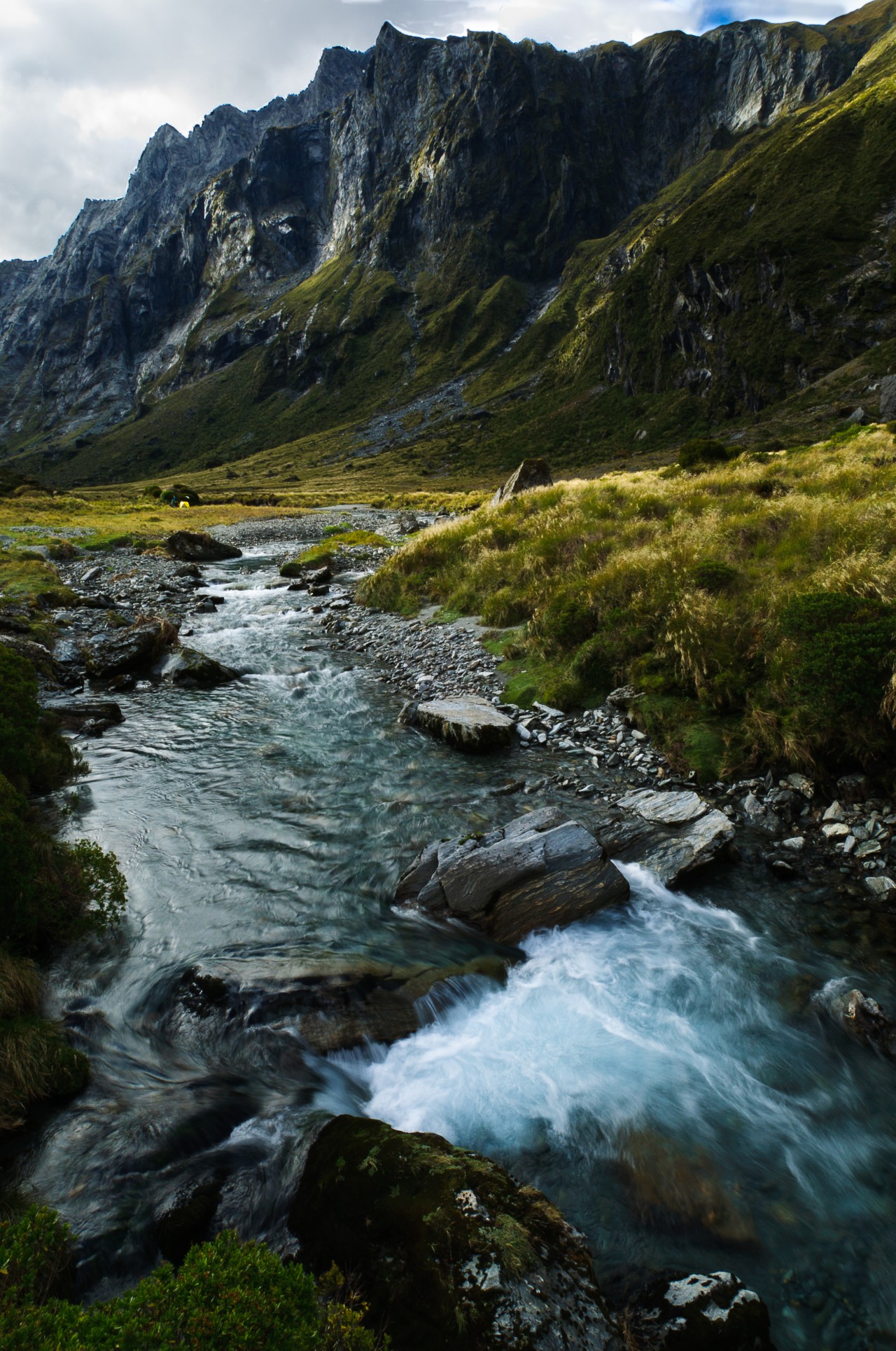 The head of the Young River, just below Gillespie Pass in Mt Aspiring National Park, is a fine place for a campsite. I love how the evening light catches the cliffs in the background. I stopped down the aperture and ISO to slow the shutter speed and get just a bit of blur in the river flow.