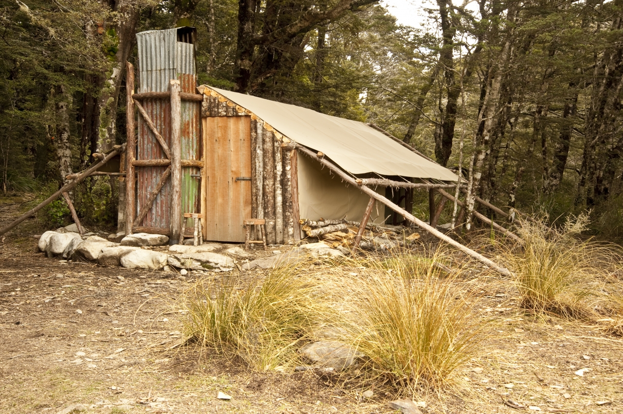 When government shooters began tackling the so-called ‘deer menace’ in 1930, the country was in the grip of the Great Depression. In those parts of the backcountry where there was no existing shelter, funds rarely extended to building new huts. So instead, the Department of Internal Affairs built tent camps, often using beech pole framing, and usually with a large chimney at one end. Culler Maurice ‘Red’ Fairhall, who worked in Canterbury’s Lake Sumner area in the early 1950s, described them: