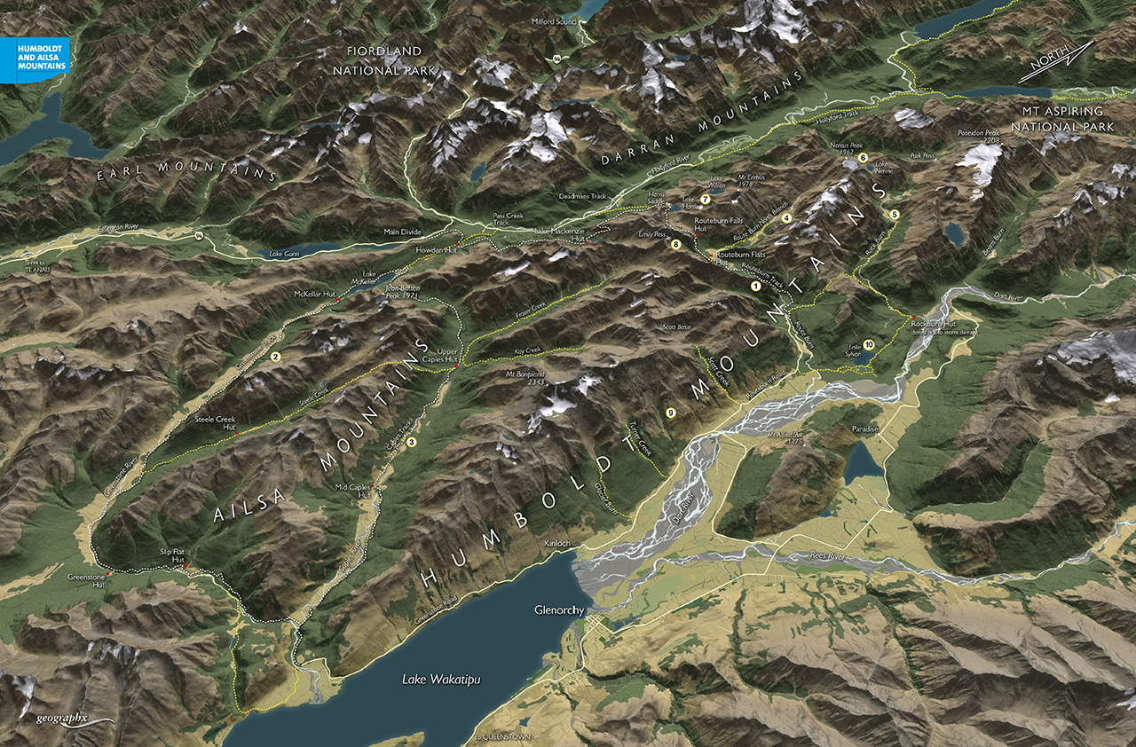 This duo of ranges, the Humboldt and Ailsa mountains, in Fiordland National Park are famous among mountain lands in New Zealand. With the Routeburn and Greenstone-Caples tracks cutting through their length and breadth, as well as the position of the ranges between the Milford Road and the head of Lake Wakatipu, you can be sure that almost anywhere you tread here will be a much heralded experience.