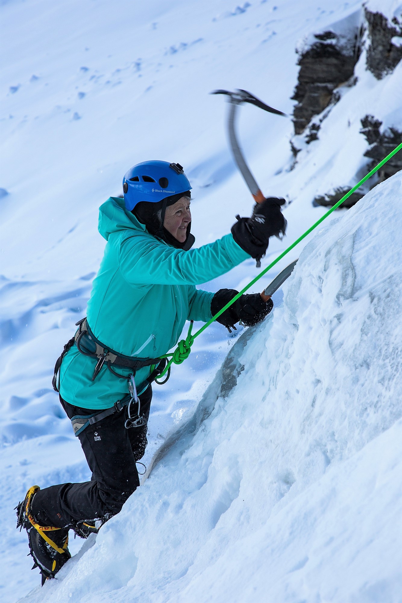 Because to me, it felt absolutely like I was bashing around wildly. Heart racing. Flailing with arms and axes and kicking hard with crampons. Relying on just six tiny points to hold me on this vertical cliff. Defying gravity.
