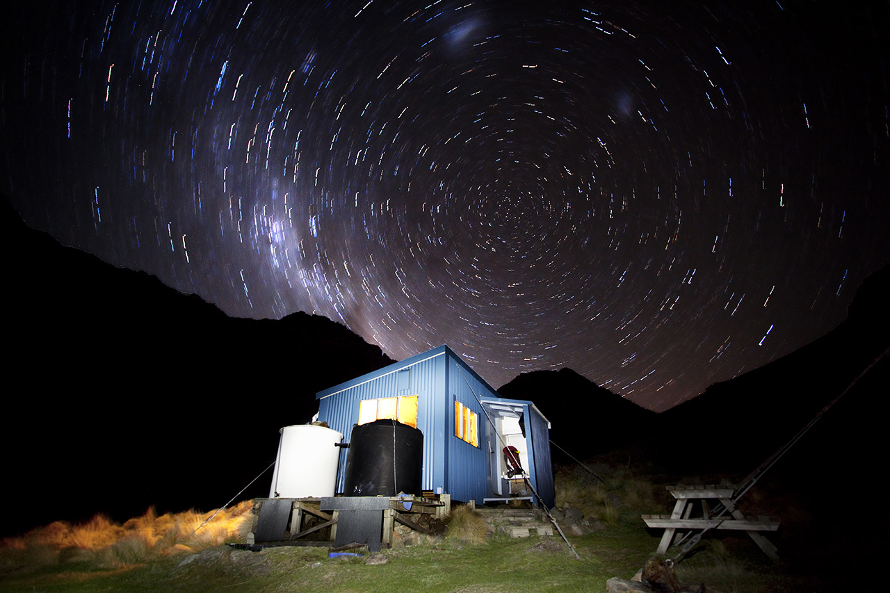 It was a moonless night with no wind or dew. The hut windows were illuminated by a solitary candle, the thin blue walls lit by the beam of my headlamp. While holding down the shutter for eight-minute exposures, my camera recorded the southern sky in all its glittering glory. I watched the Milky Way burn through a blackening sky. The wind sang a song through the tussock. The river roared. I was grateful to be alive. Our expedition had been perfect, to a tee.