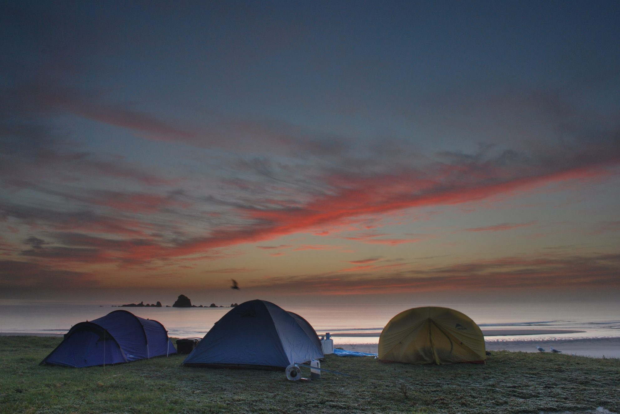 The sun gently emerged from the placid ocean. Just 30-minutes from Whangarei and in this idyllic spot is only me, the sea and the sun. I gently pressed the shutter, whose click briefly interrupted the soft gurgle from the stream to my right. Even the gulls nesting on Awarua Rock were relatively peaceful this morning. Crouching barefoot on the sand my only worry is how to create the morning atmosphere on camera. Panning towards my left the long, sculptured dunes come to an end as cliffs topped with pohutukawa trees rise from the beach. Eventually the sand ends altogether and is replaced with rock perches perfect for sinking a baited hook from. Our tents stand behind me, pitched on the grassy bench of an old quarry dug into the hill.
