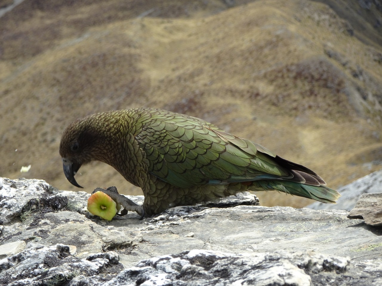 Lindsay Jackson: “This cheeky kea (pictured) quickly and expertly stole the apple core from a visitor’s back pack pocket at the top of Ben Lomond.”
