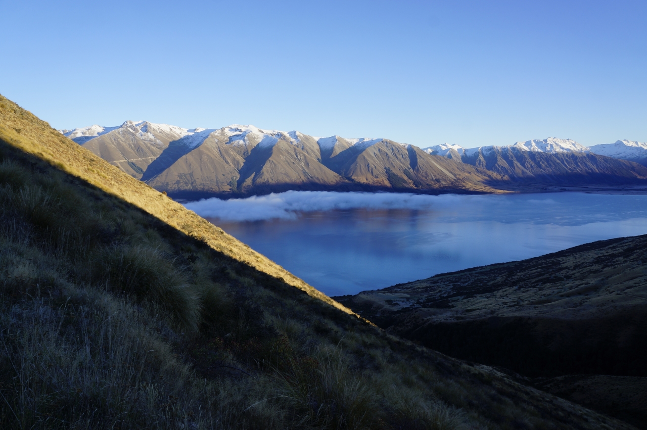 In gaelic, ‘Ben’ refers to a mountain, while in Maori ‘Ohau’ means a windy place; both translations seemed incorrect as I surveyed Ben Ohau from the eastern shore of Lake Ohau. Mist lay over the lake’s surface, confirming the air’s stillness. The mountains at the lake’s head and opposite shore put the Ben firmly in its place; it was a hill, although, to be fair, with 980m separating the summit from its base, it was a big one.