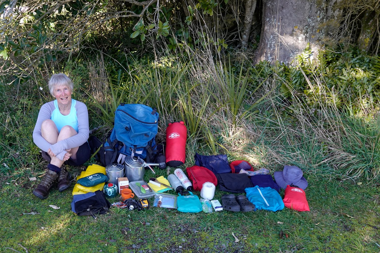 → Sundries – Headlamp, spare batteries, insect repellent, sunscreen, lip balm, hand sanitiser, sunglasses, ear plugs, toilet paper, matches, half a candle, toiletries, Chux cloths (for washing/ drying myself), Crocs, whistle, pencil and paper, survival blanket