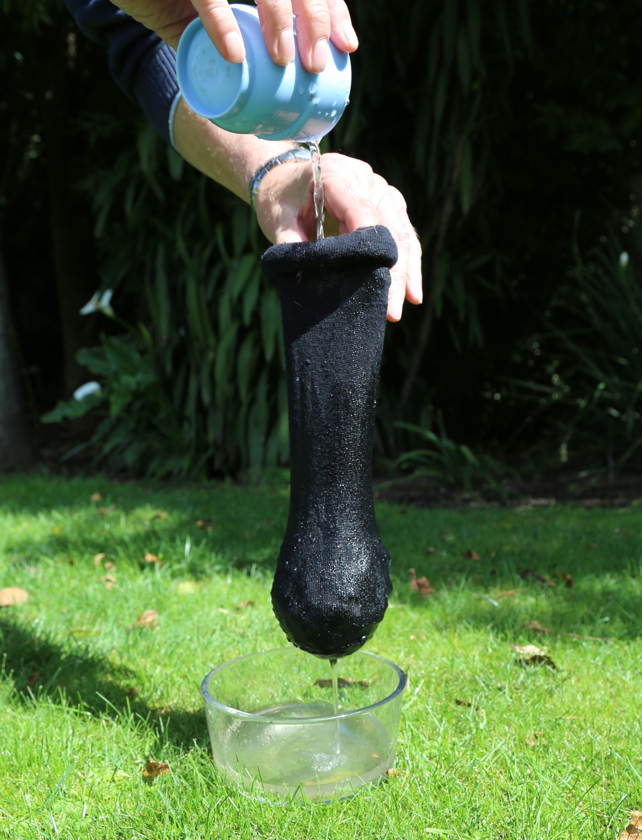 A sock filled with sand, stones and charcoal, can be used to filter water.