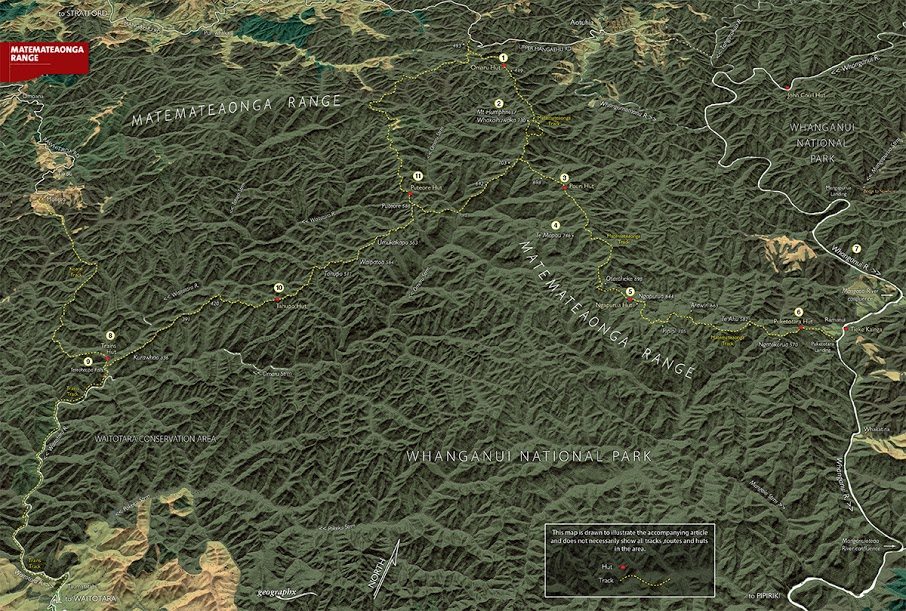 Connecting inland Taranaki with the Whanganui River, the Matemateaonga Range arcs roughly from west to east. In an otherwise complex, deeply-riven landscape, the range’s crest is curiously level – reflecting its origins as an old peneplain. No wonder Maori had a route along it and Europeans planned to build a road over the crest, too. Some work on the road was completed in the early part of the 20th century but, happily for trampers, it never became much more than a dray road. Plans to settle the area were abandoned during the 1920s and 1930s, after which the range was left to the occasional tramper or possum trapper.