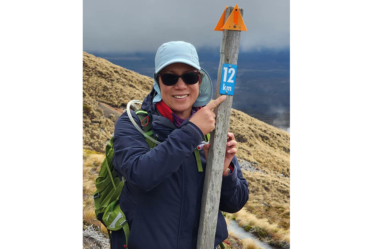 Winner: Rosie Perez walked the Tongariro Alpine Crossing, stopping for this neat photo at the 12km mark (featured image)