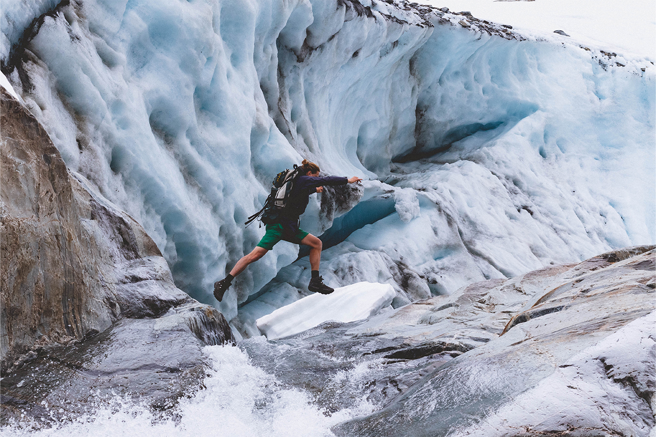 Krisztian Vass jumped over the meltwater of Brewster Glacier.