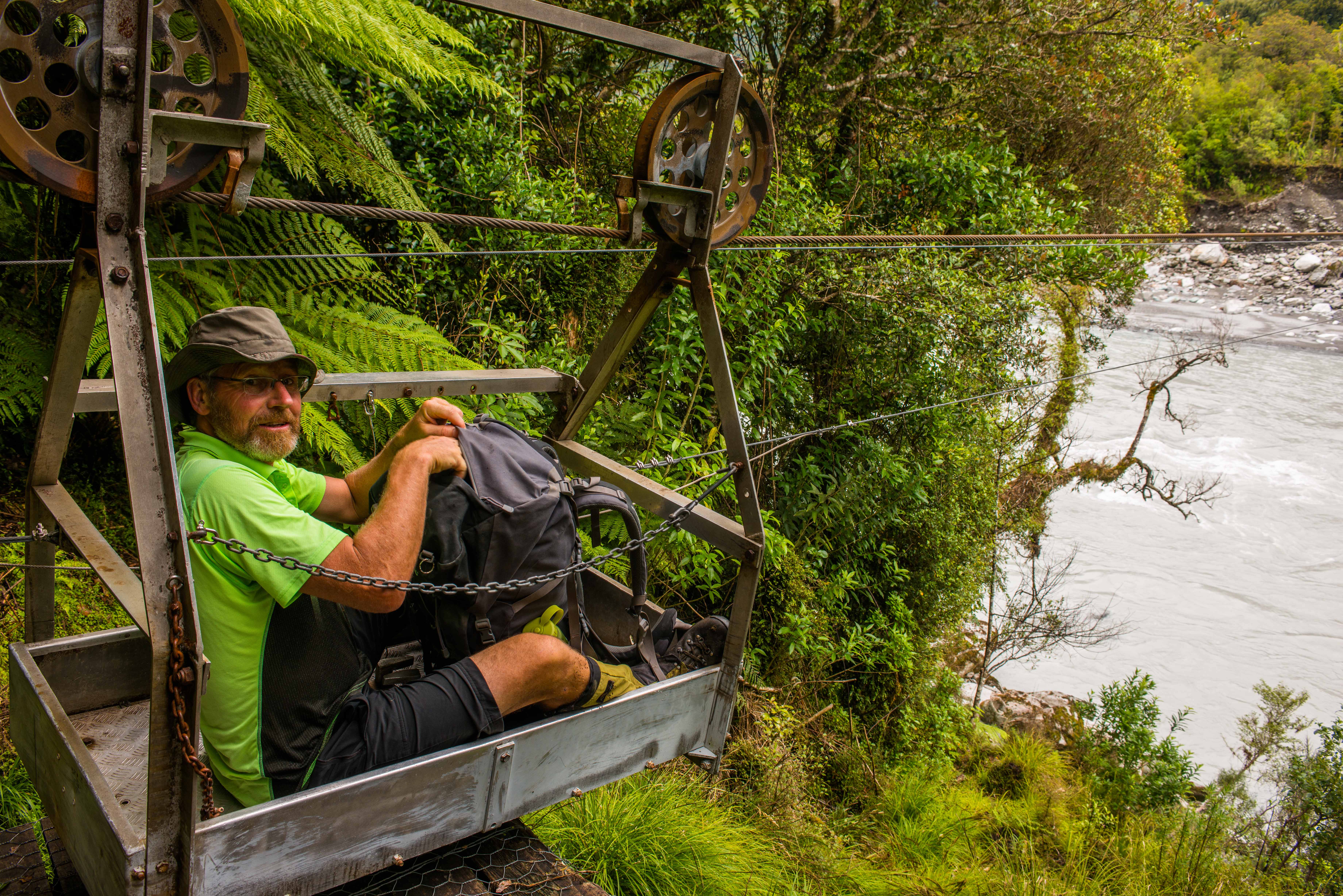 The cableway is quite something. Spanning the river on a single 100m-long wire, the small aluminium cage runs trampers across in a long swoop to mid-river and then a slow grind on the winch to the far side. It’s a buzz to zoom out to the middle, airily observing mountain, river and sky as Tim winds me to the far side.