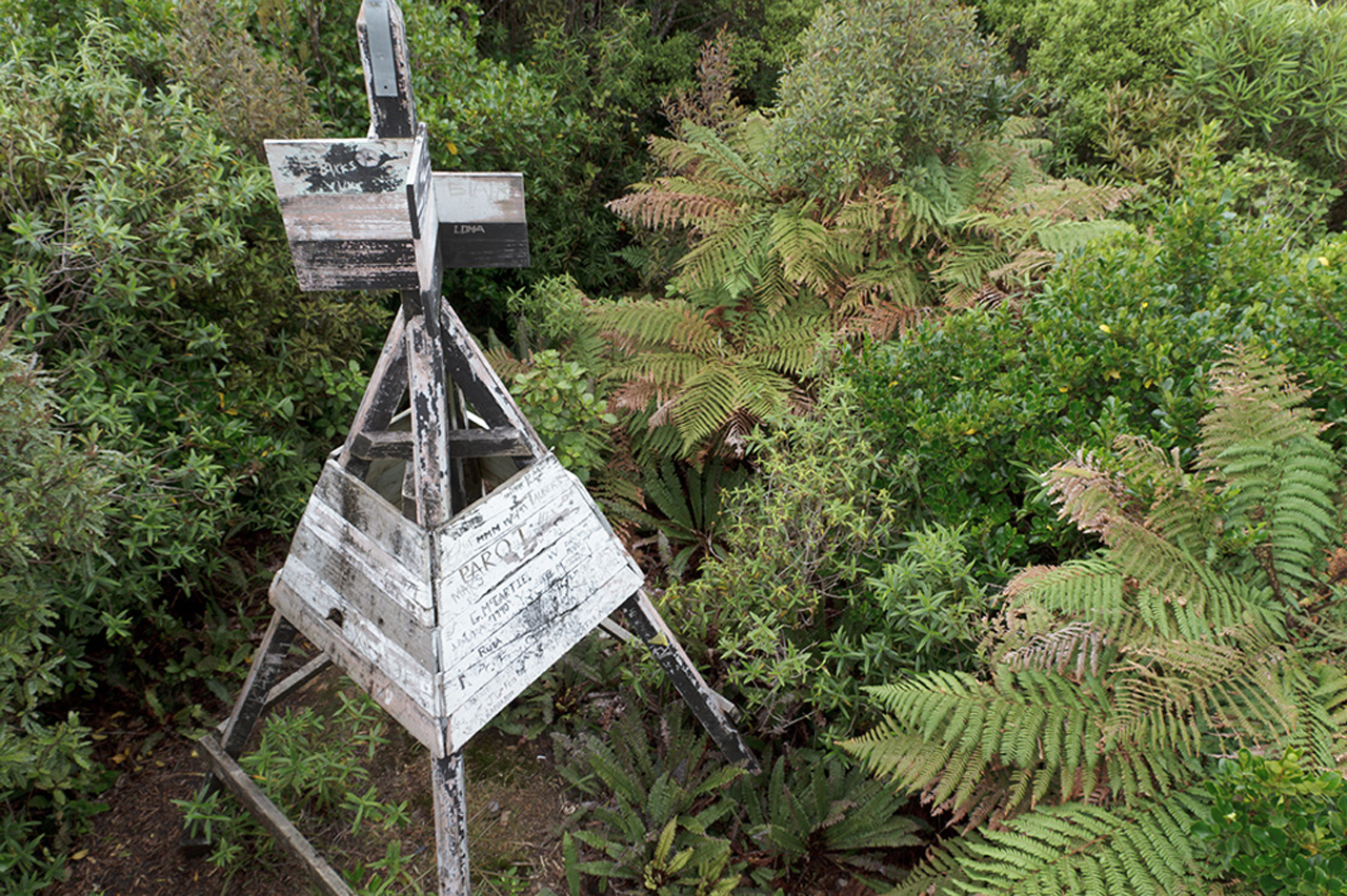 Shortly before the summit is the unmarked Trig K Hut, a primitive corrugated iron affair that I was told scientists occasionally use when visiting to take air samples. Cold wind and rain made us duck into its dark and dingy interior for a bite to eat and to warm up.